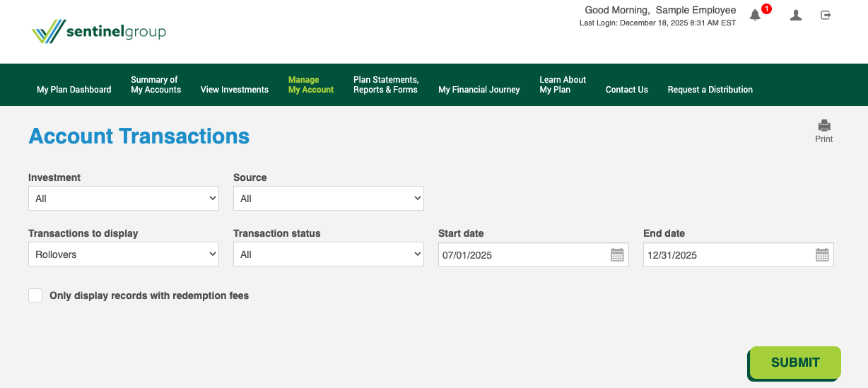 Your former account custodian may mail the check directly to your existing plan custodian using the instructions you provided when requesting your rollover to your plan at Sentinel. However, if the check is sent to you, you will then need to mail it to your new plan using the delivery instructions provided on your form. Once the check is received in the Plan's account, we will allocate the rollover deposit to your account. You will receive an email notification (pictured on the right) to let you know your request has been completed. At this point, you'll be able to log into your account and view the rollover transaction (see below). | ![]() |